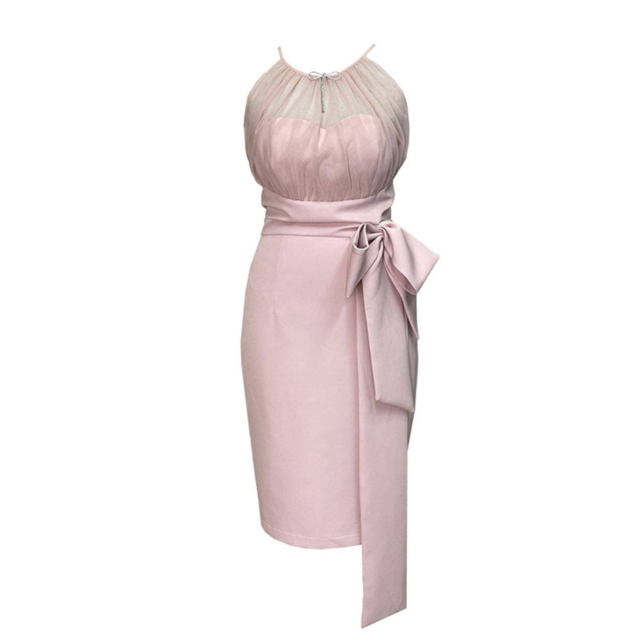 透け素材のホルターネックが首元を美しく演出するミディアムドレス。