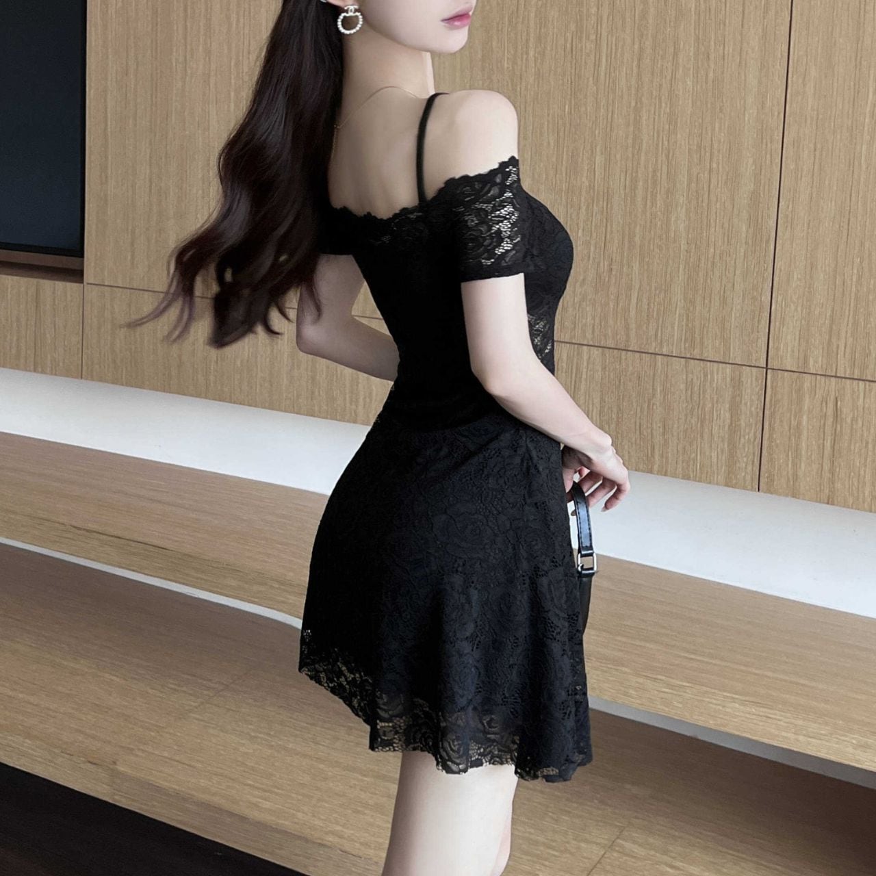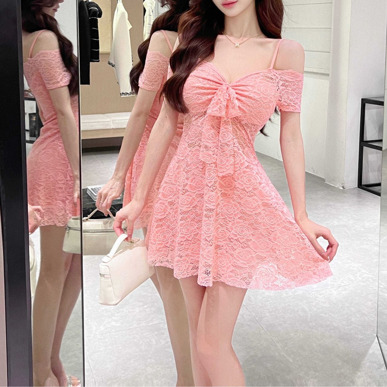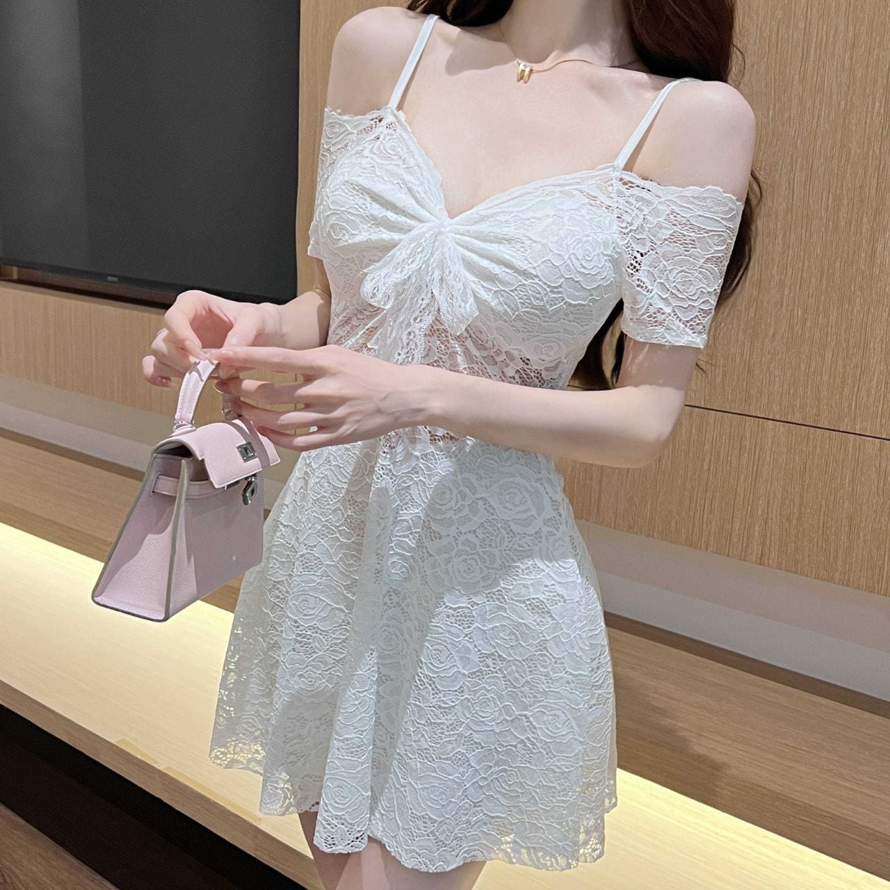 オフショルダーデザインで、デコルテラインを美しくミニドレス。