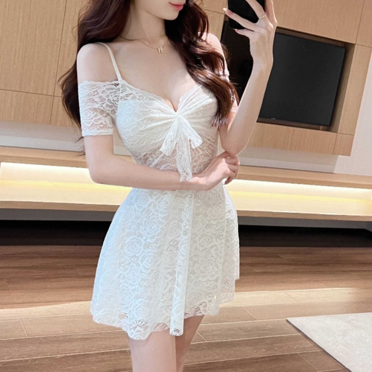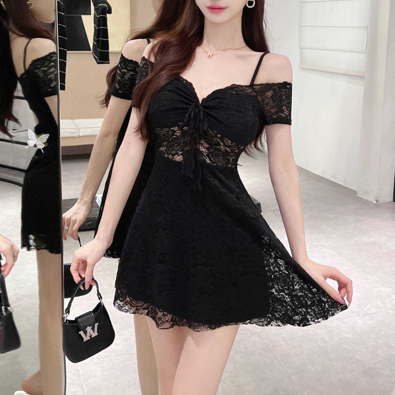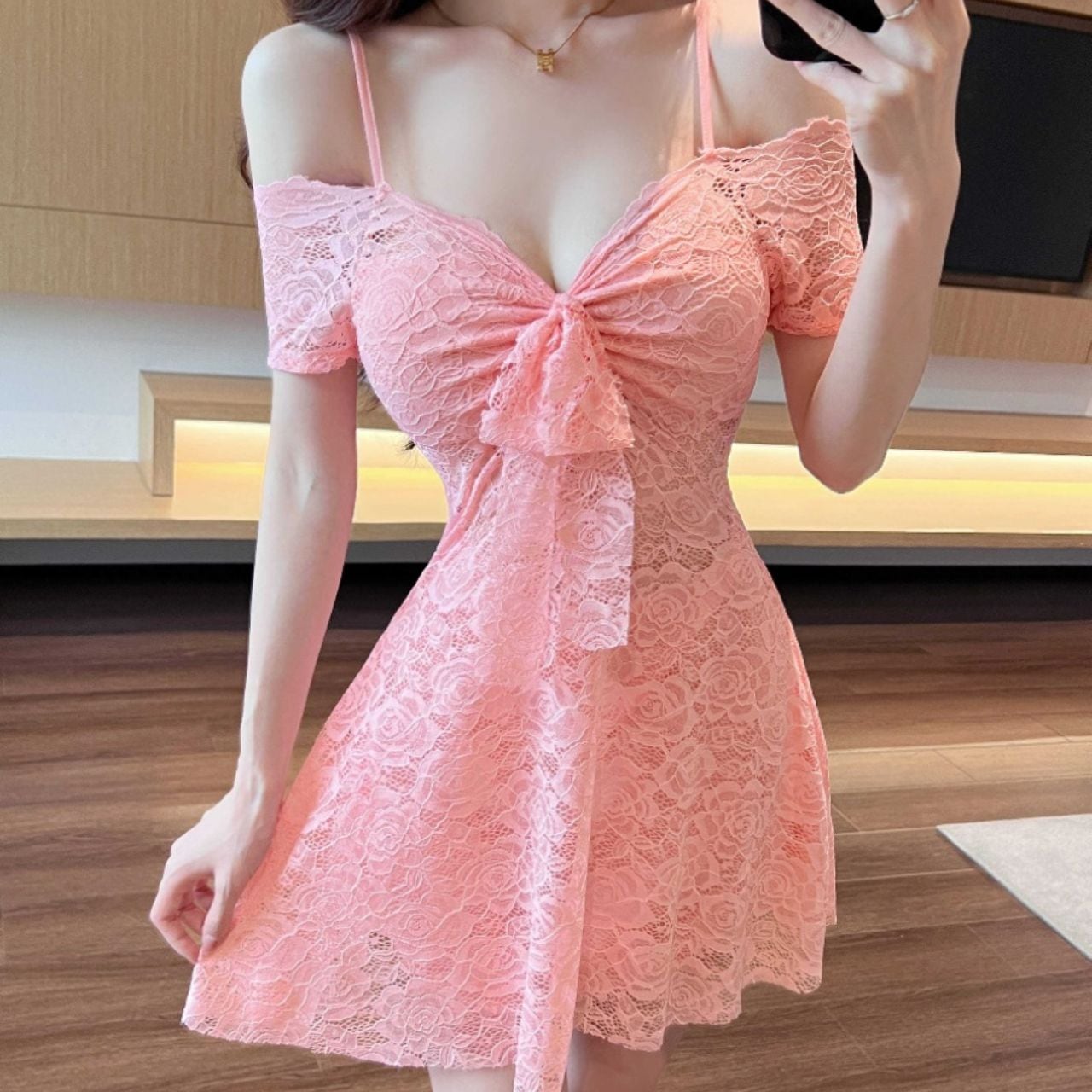 オフショルダーデザインで、デコルテラインを美しくミニドレス。