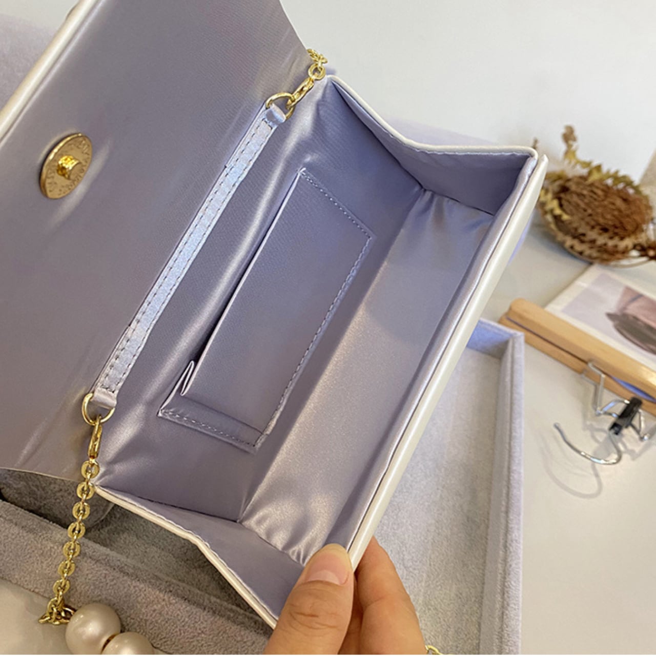 アーチ型のゴールドハンドルとパール装飾が上品なミニバッグ。洗練されたデザインは、デイリーユースから特別な日の装いまで幅広く活躍します。コンパクトながら収納力も兼ね備え、必要なアイテムをスマートに持ち運べます。アクセサリー感覚で持ち歩ける、ワンランク上のスタイルを演出するアイテムです。