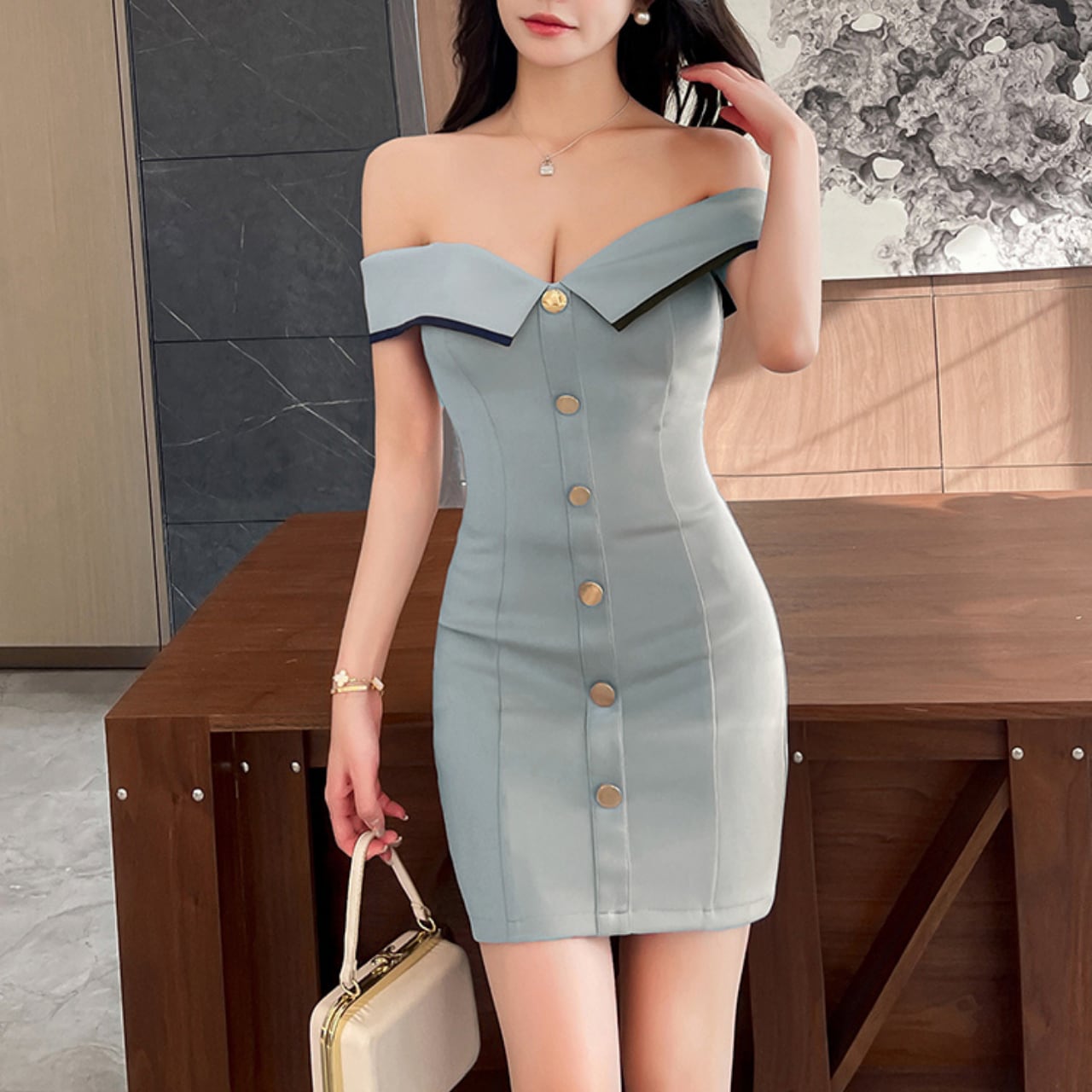 ボートネックとフロントボタンが洗練されたミニ丈タイトスカート。ミニ丈ながらもタイトなシルエットで、女性らしいボディラインを美しく演出します。フロントのボタンがアクセントとなり、シンプルながらも目を惹くデザインです。 様々なシーンで活躍できる、着回し力抜群の一着です。