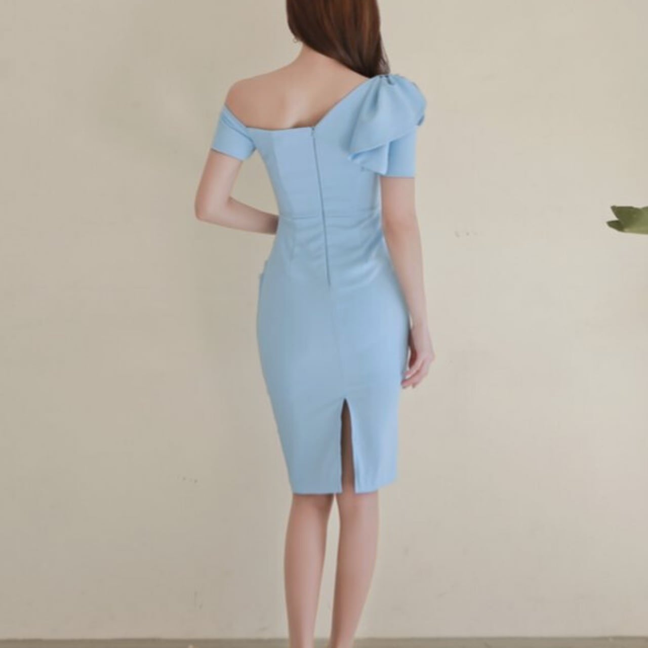 ワンショルダーのデザインが、女性らしいセクシーさを演出するミディアム丈ワンピース。