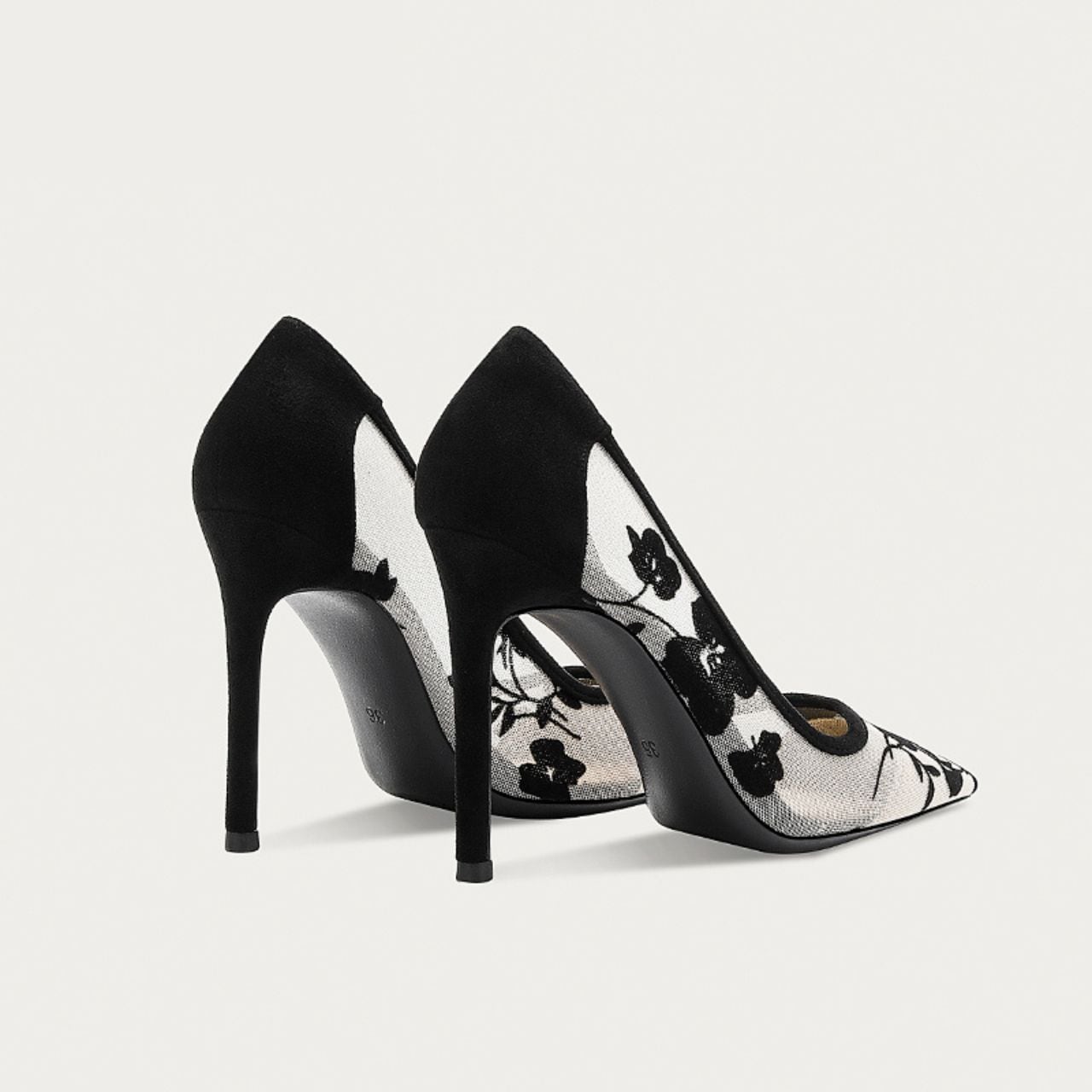透け感のあるベージュメッシュに、フラワーシルエットが映えるスティレットヒールパンプス。