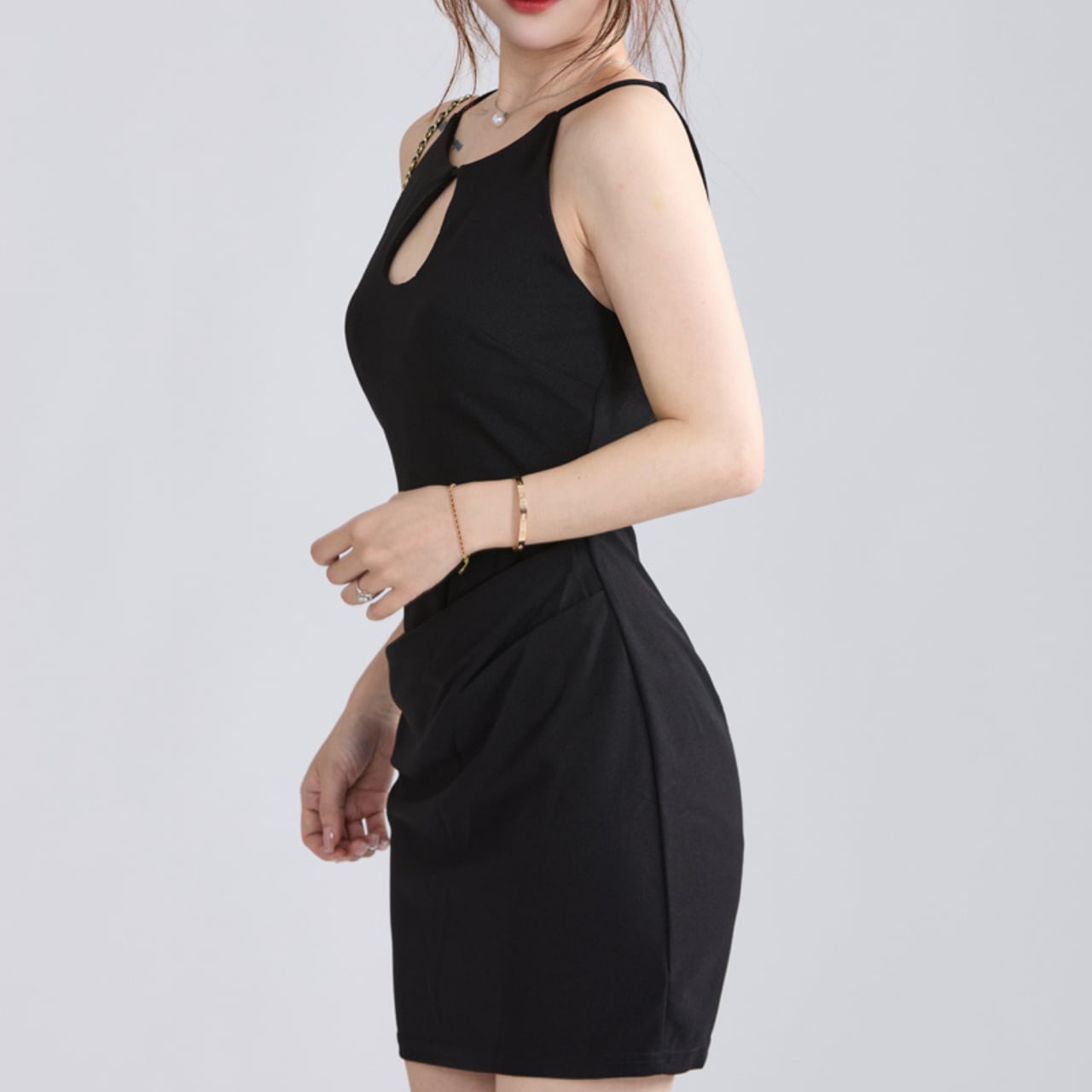 すっきりとしたノースリーブデザインが、涼しげで都会的な印象を与えるミニ丈ドレス。