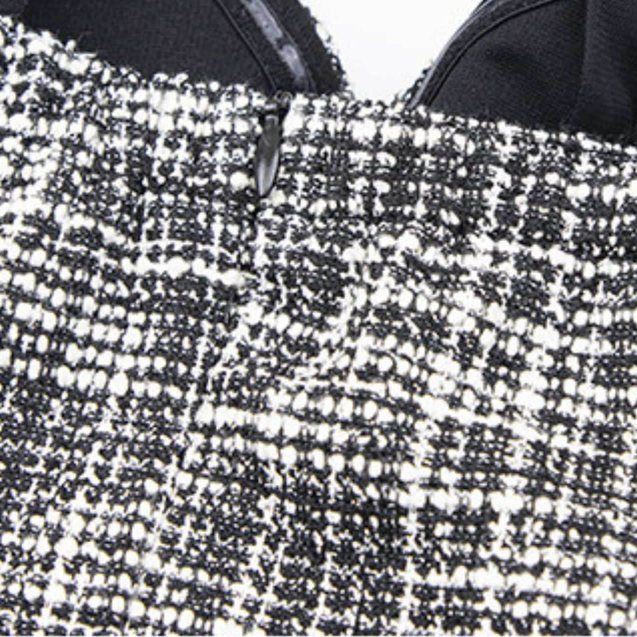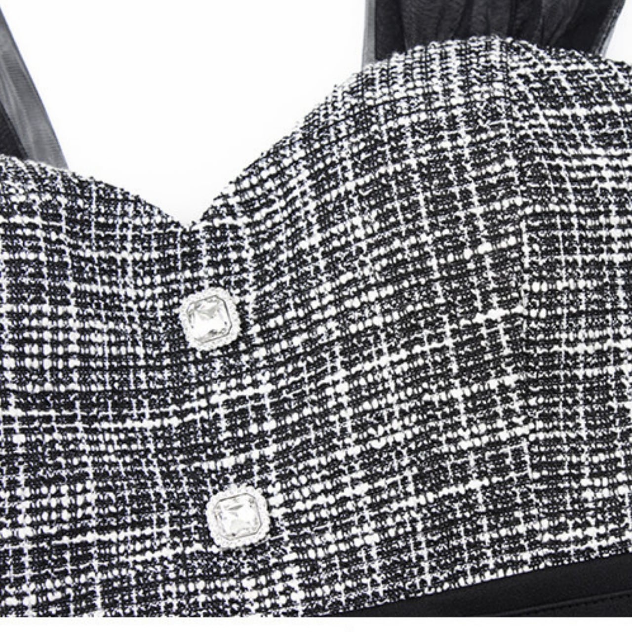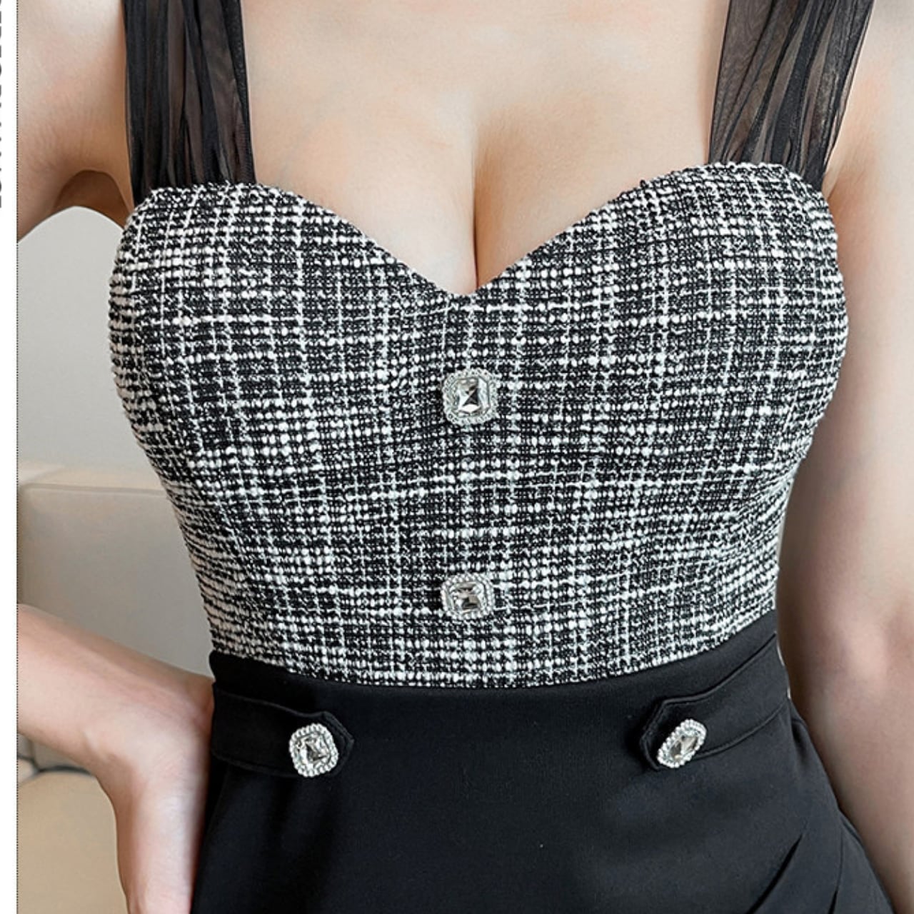 胸元のツイード素材が上品さを演出し、大人の女性らしさを引き立てます。