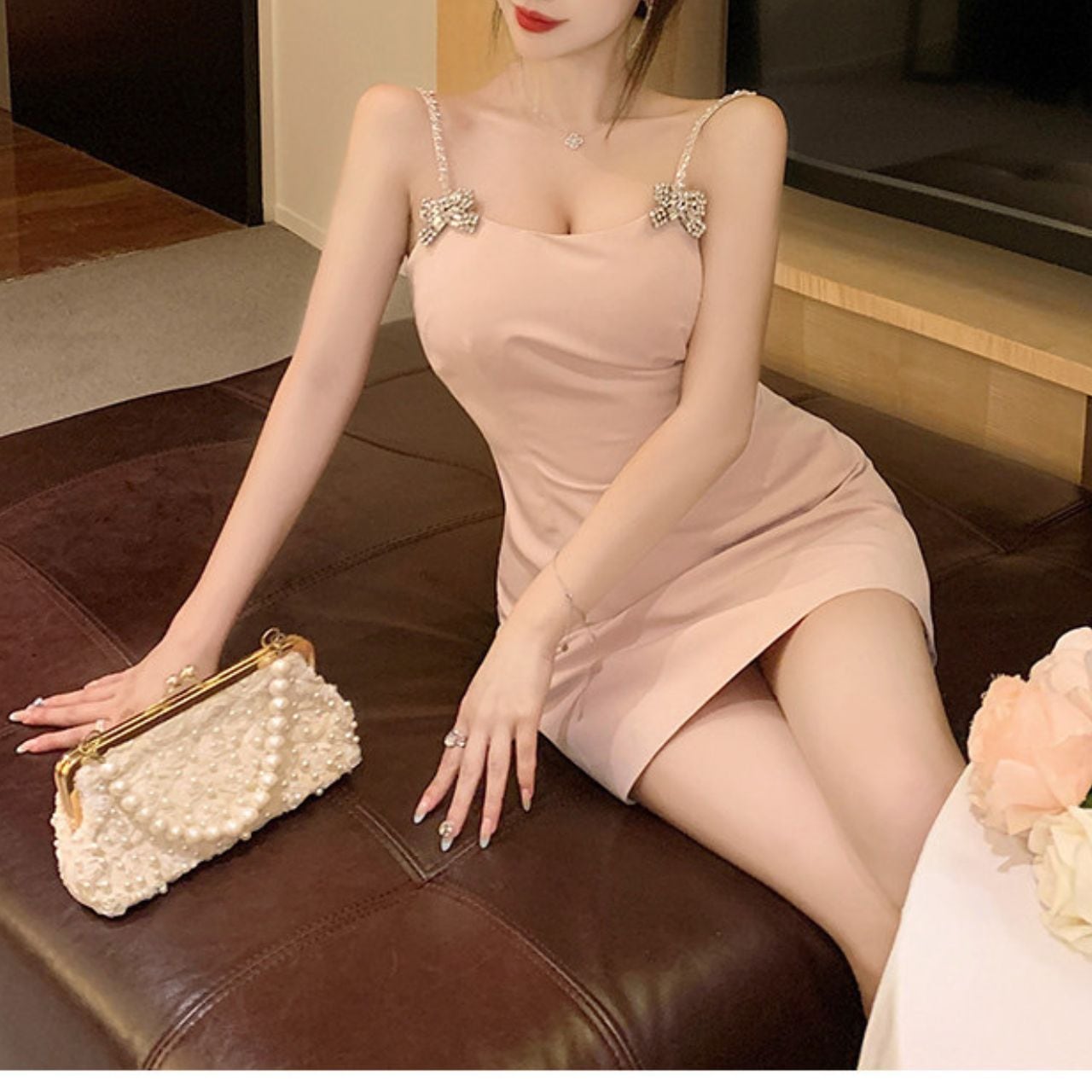 ビジューが輝きを添えるキャミソールミニドレス。