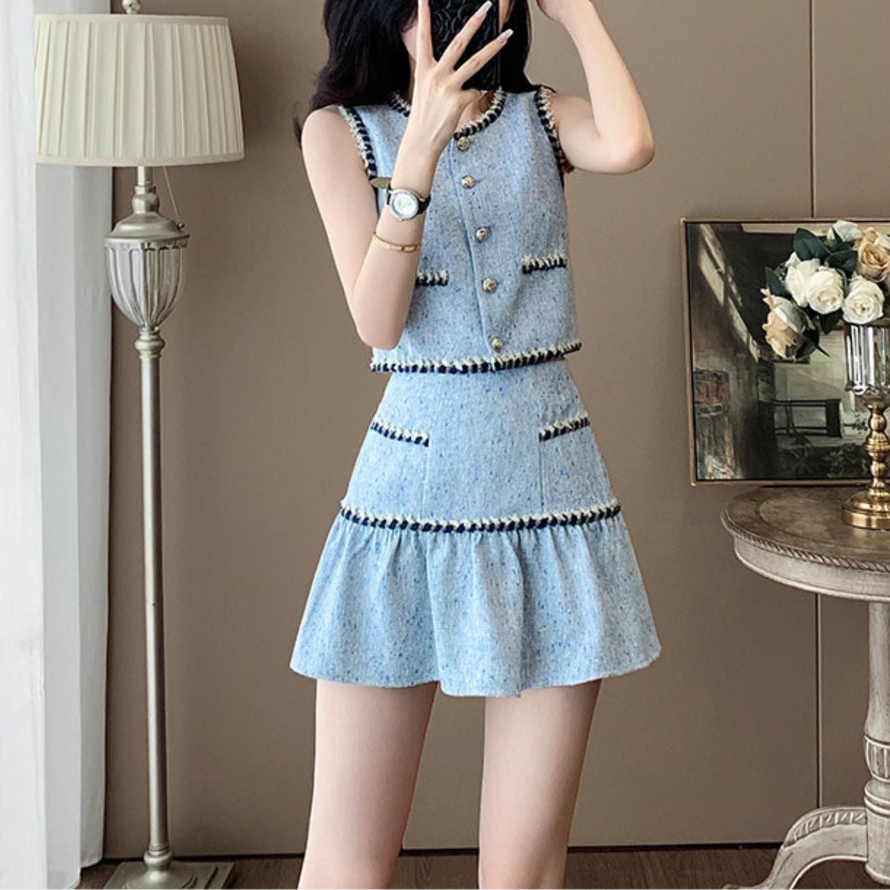 コンパクトなシルエットのジレとAラインのスカートがキュートなセットアップ。スカートの切替ラインがスタイルを上品に引き立てます。手持ちのアイテムと組み合わせて、それぞれ単品でも着回しが可能です。
