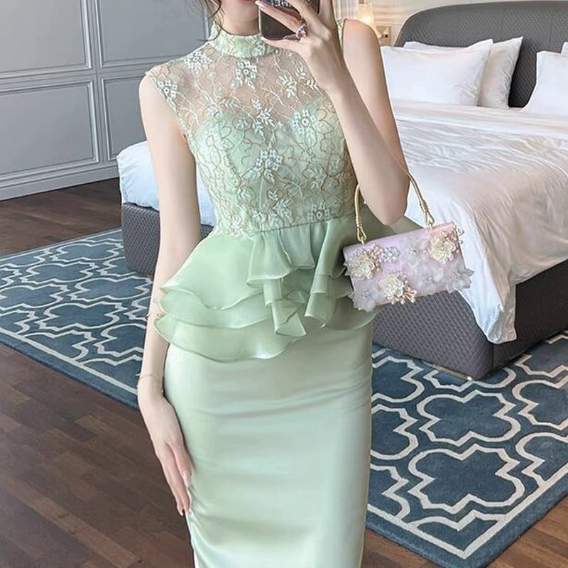淡い薄緑が爽やかさを感じさせるペプラムのタイトスカートドレスです。
