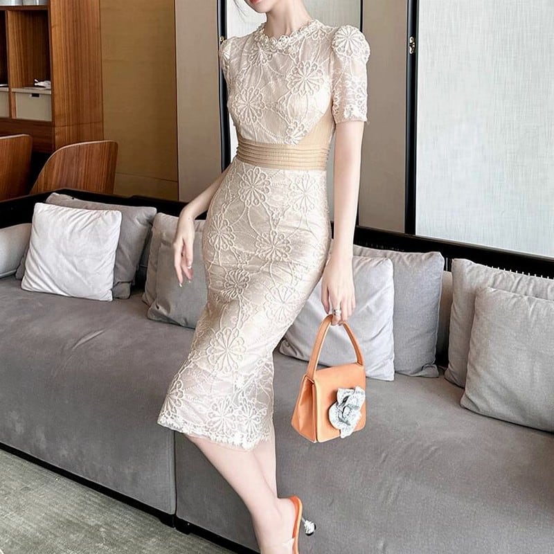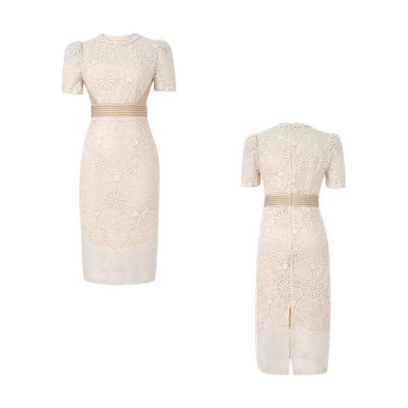 膝丈で落ち着いた印象のフラワーレースワンピース。