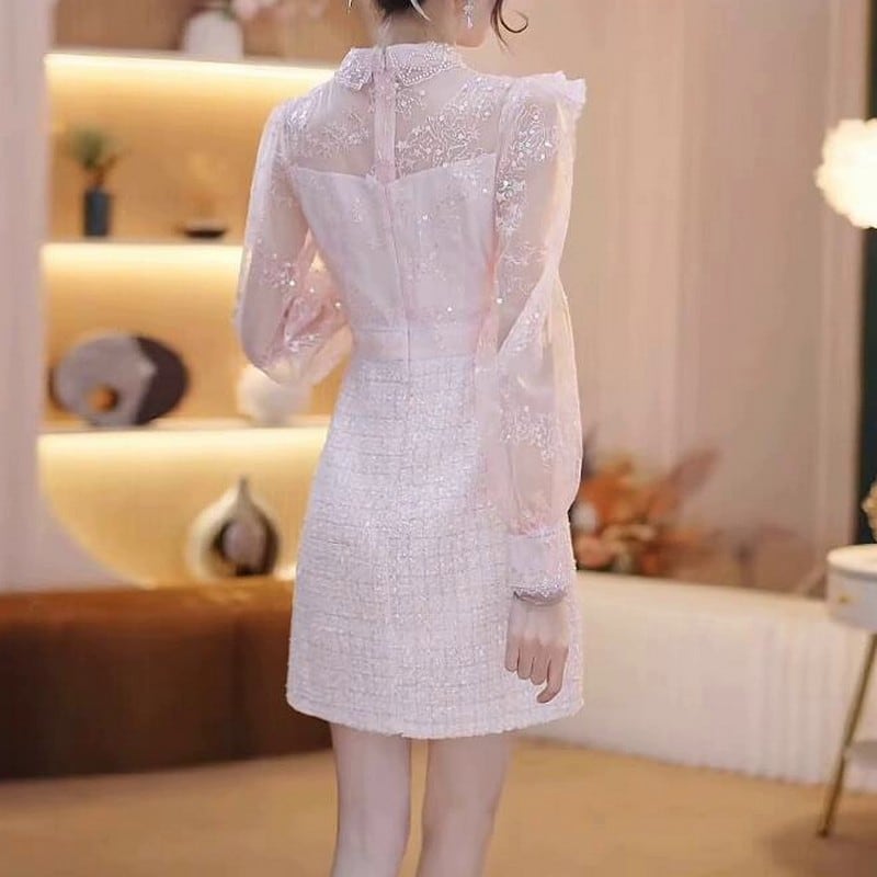 優しい薄いピンクとツイードスカートの組み合わせが女性らしさを引き立てるシフォンワンピース。