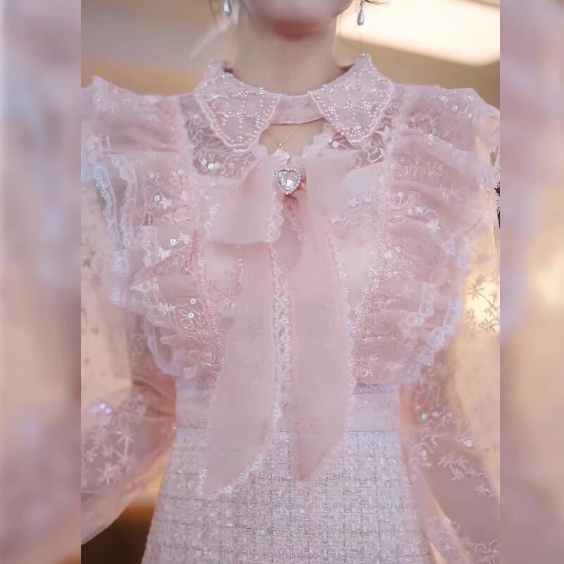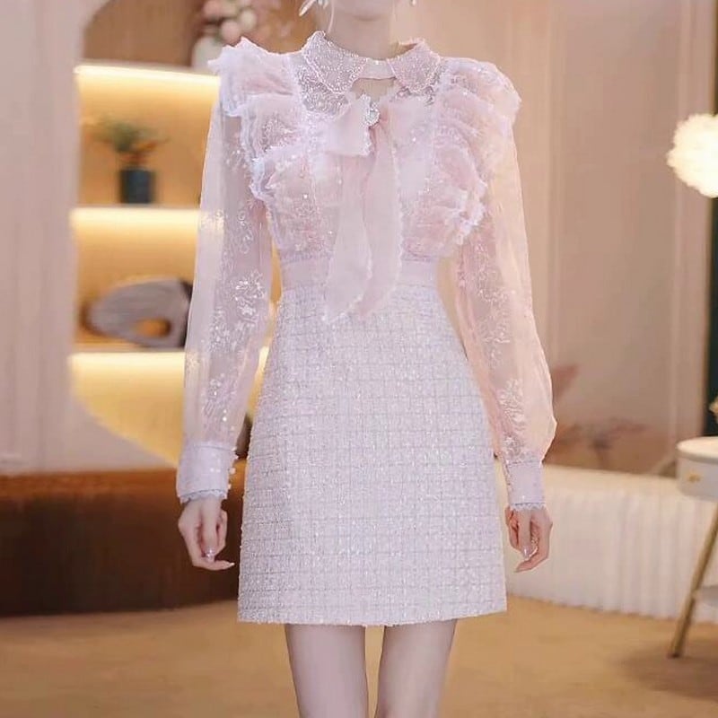 上半身のシフォン素材が軽やかさを演出し、ツイードスカートのクラシカルなデザインが洗練された雰囲気を添えます。
