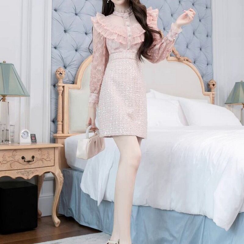 胸元のフリルとシースルーの袖が愛らしい薄ピンクのドレス。
