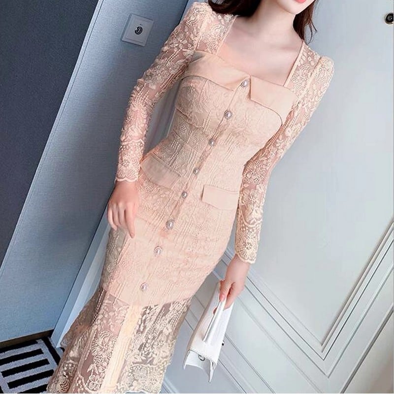上品で優雅なベージュのレースマーメードミディアムドレス。