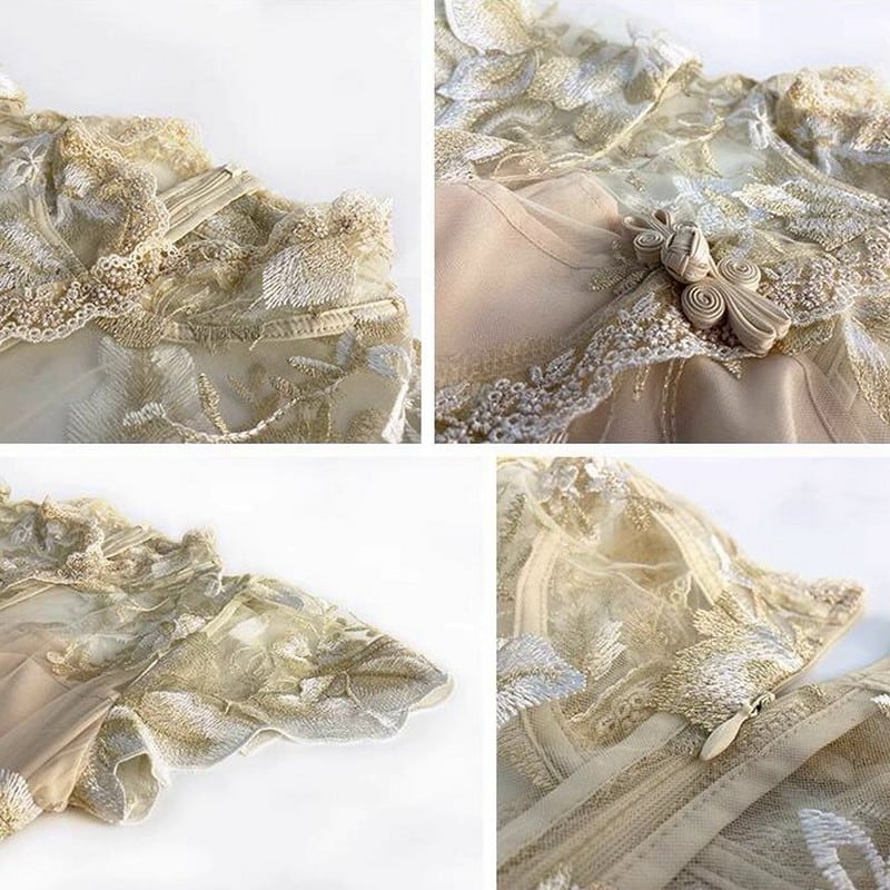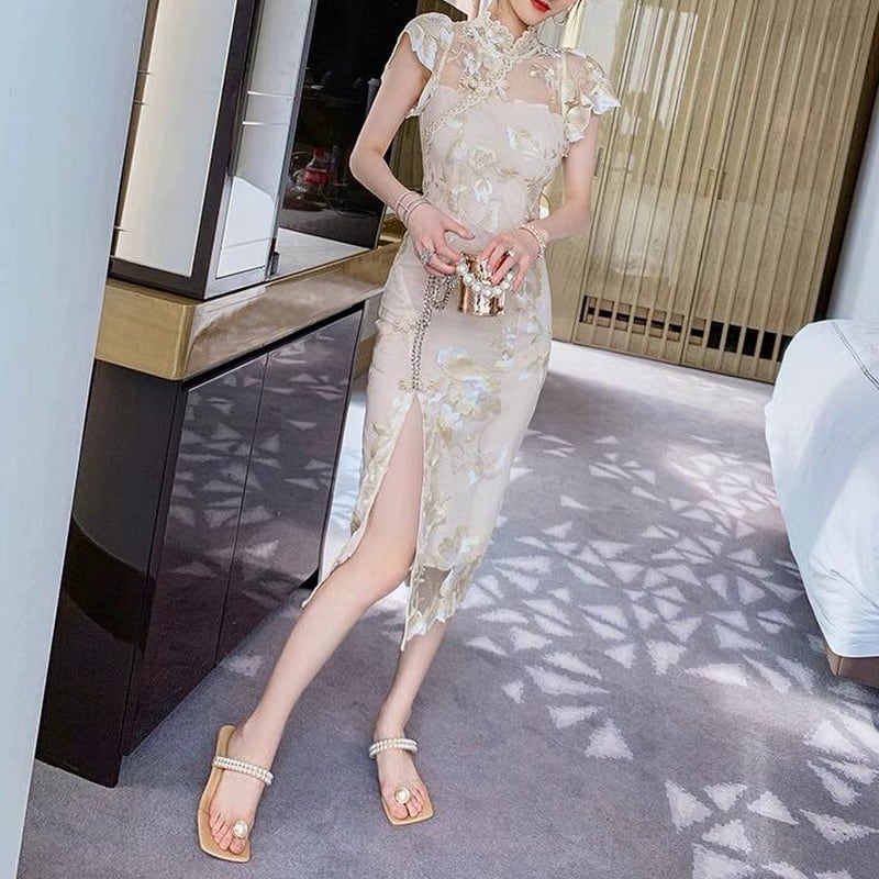 エキゾチックな魅力と上品さが融合した、チャイナ風デザインのシースルースリットドレス。