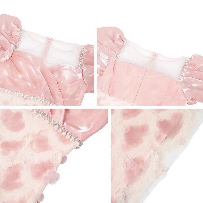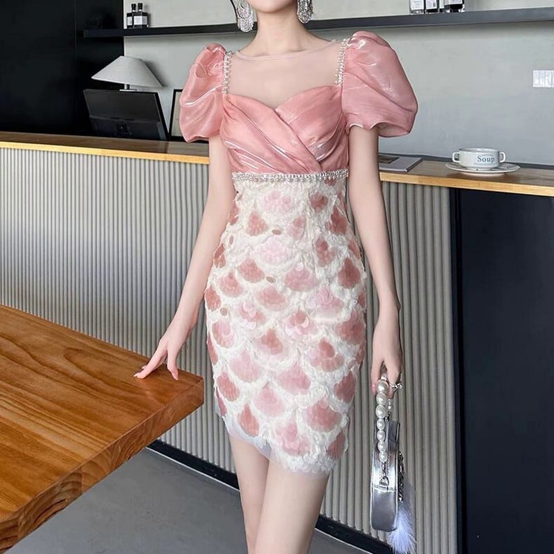 上品なピンク色に輝くパール付きの鱗柄風デザインが特徴のタイトミディアムドレス。