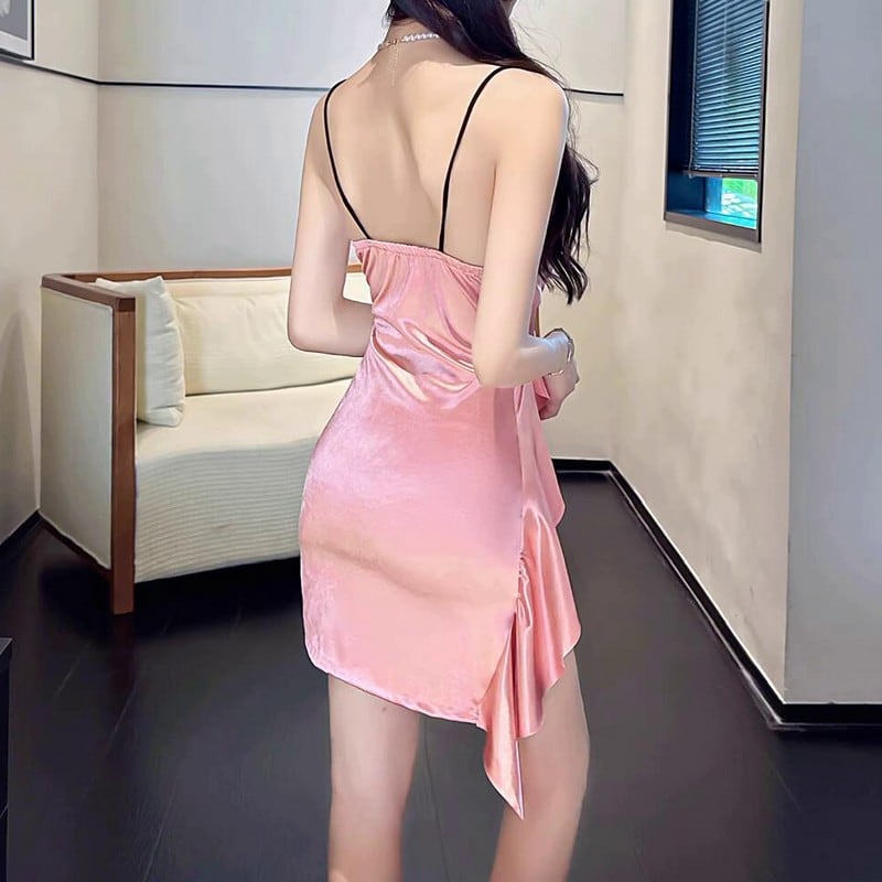 光沢感のあるサテン生地が、動くたびに美しいシルエットを引き立て、上品でありながらセクシーな魅力を放ちます。