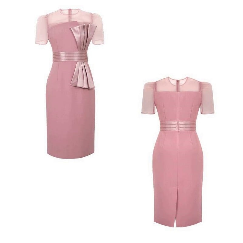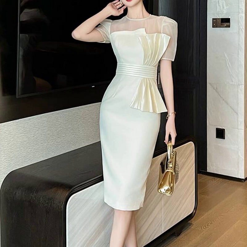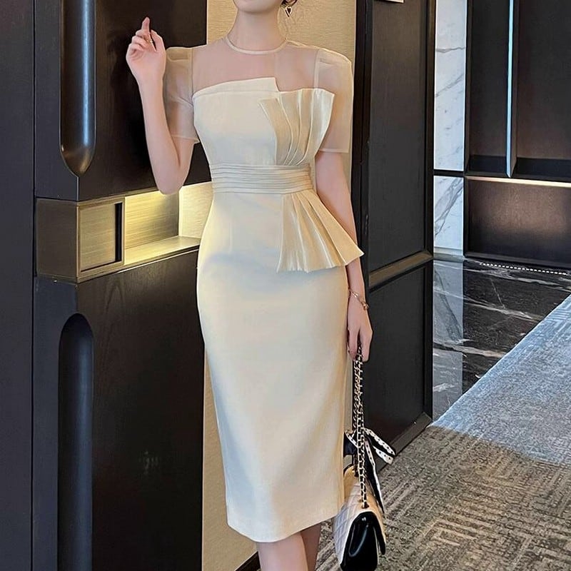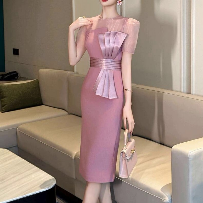 ウエスト部分のプリーツとリボンが特徴的なエレガントなミディアムドレス。シンプルながらも上品なデザインがお店での特別な時間をさらに引き立てます。