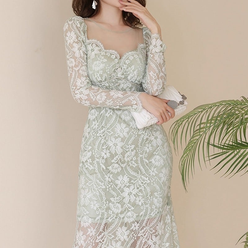 繊細な総レースが魅力的なVネックミディアムドレス。薄いグリーンの優しい色合いが、上品で華やかな印象を与えます。