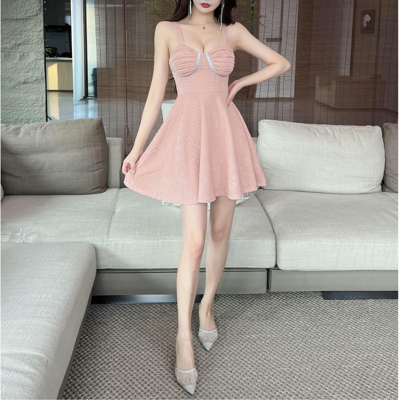 Aラインシルエットが女性らしい魅力を引き立てるキャミソールミニドレス。